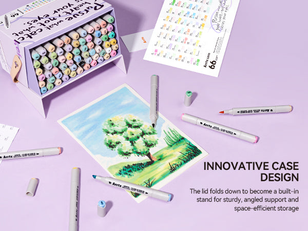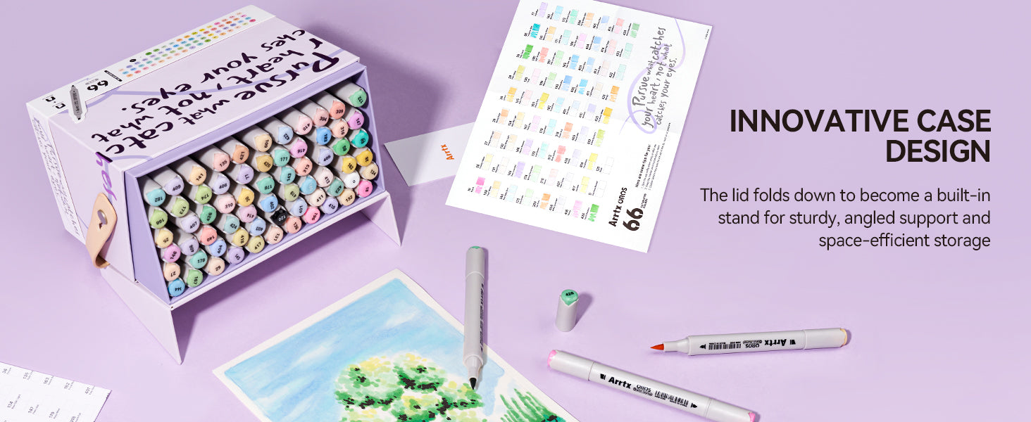 All of the alcohol-based markers are packaged in a beautiful gift bag with 66 wells and the top cover of the box can be used as a stand to keep the markers stay tidy, organized.