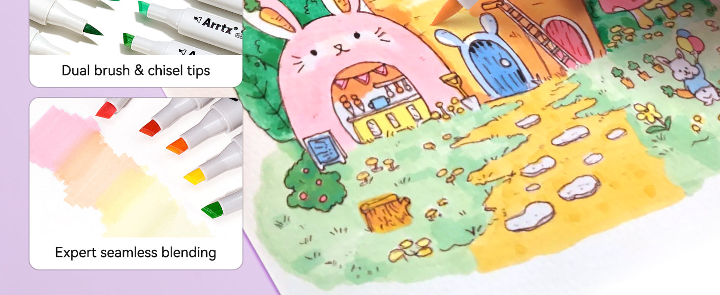 Durable quality fiber dual tip markers:the brush is great for sweeping or detail coloring, and the chisel tip is for calligraphic strokes or quick color in large areas.