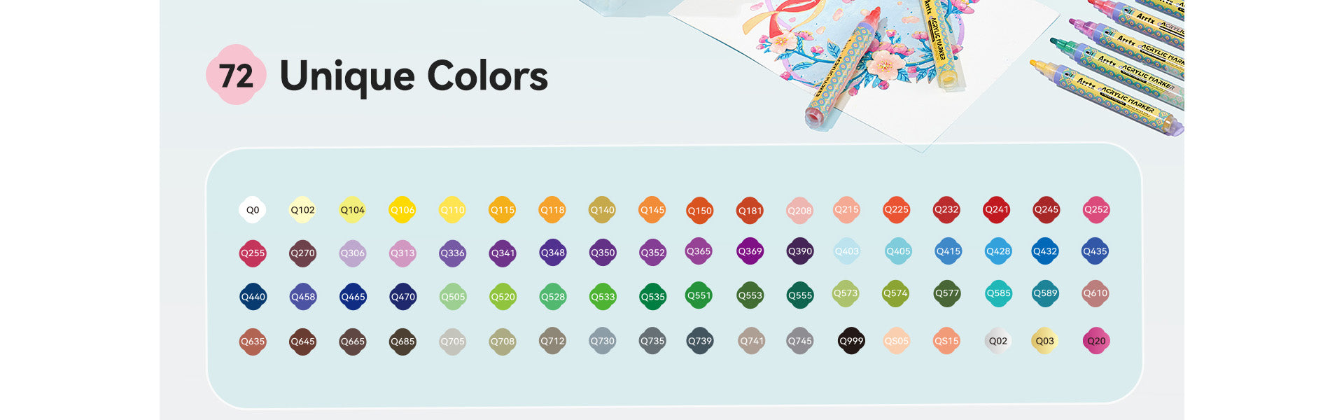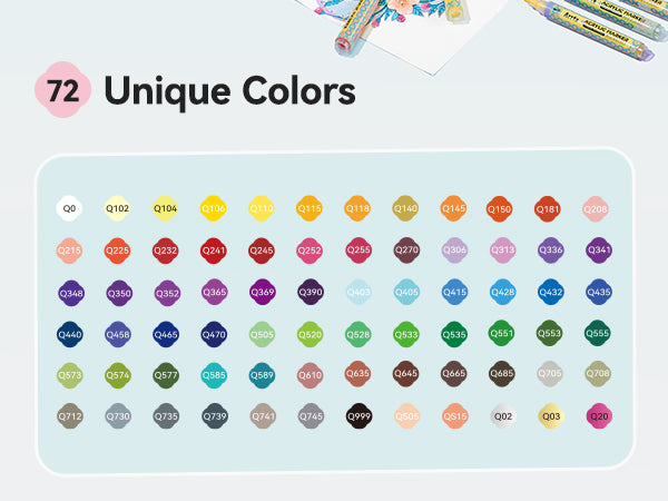 • 72 Vibrant Colors: The new 72-color set of the former valve adds 42 new colors compared to the 48-color set, including 30 colors from the 48-color set. Additionally, the nib refills have been expanded with two new types of nibs: 8 hazelnut tips (1.2mm) and 26 soft tips (0.7-5.5mm). Experience a rich spectrum of colors that pop on any surface.