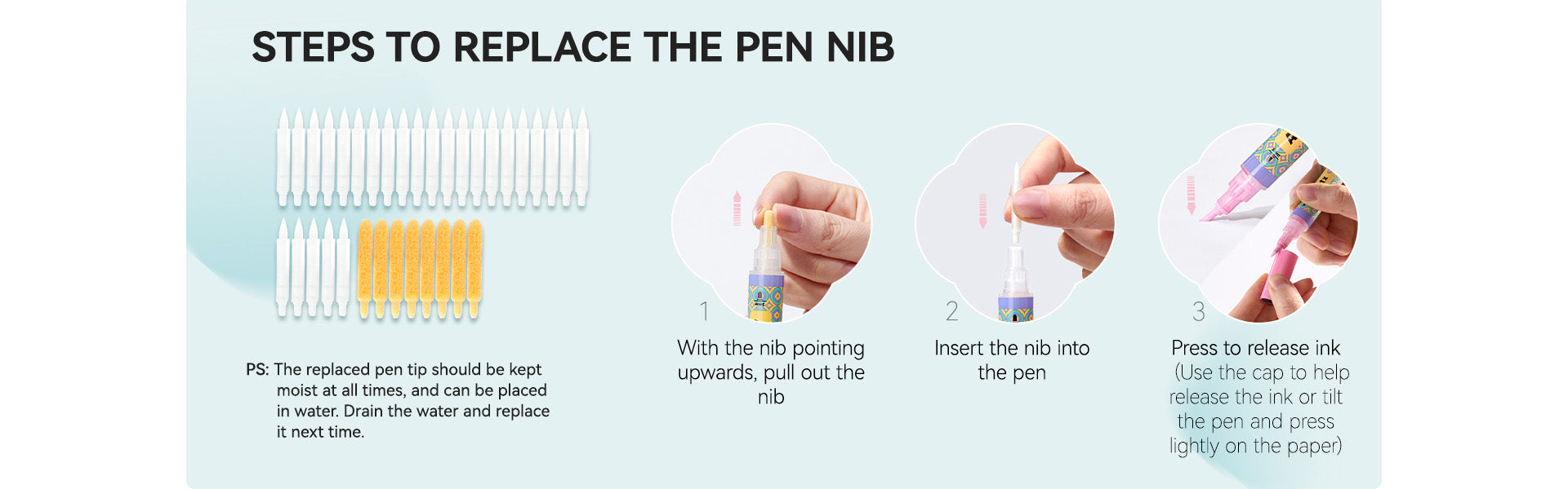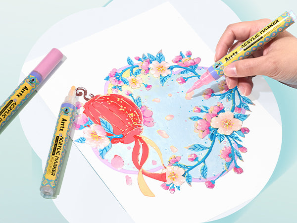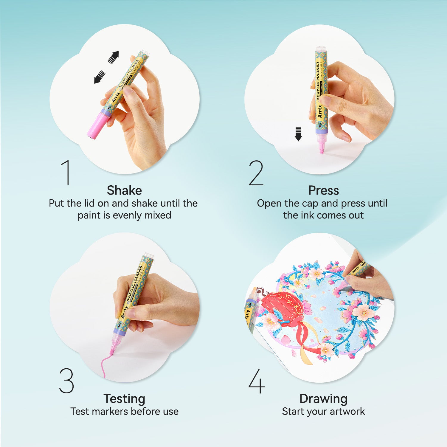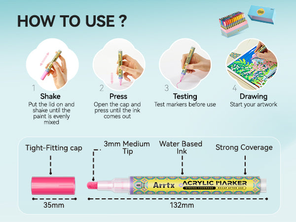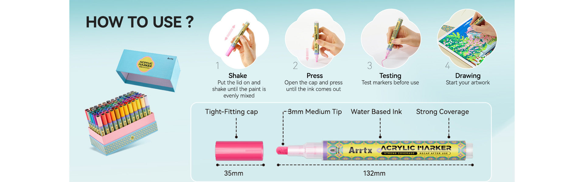 • Instruction: For Arrtx acrylic paint markers please shake the marker to mix the ink before use, and press the nib up and down or several times until markers tip fills with ink(for the first time use). Please cover the cap after use, in case the Ink dries out.