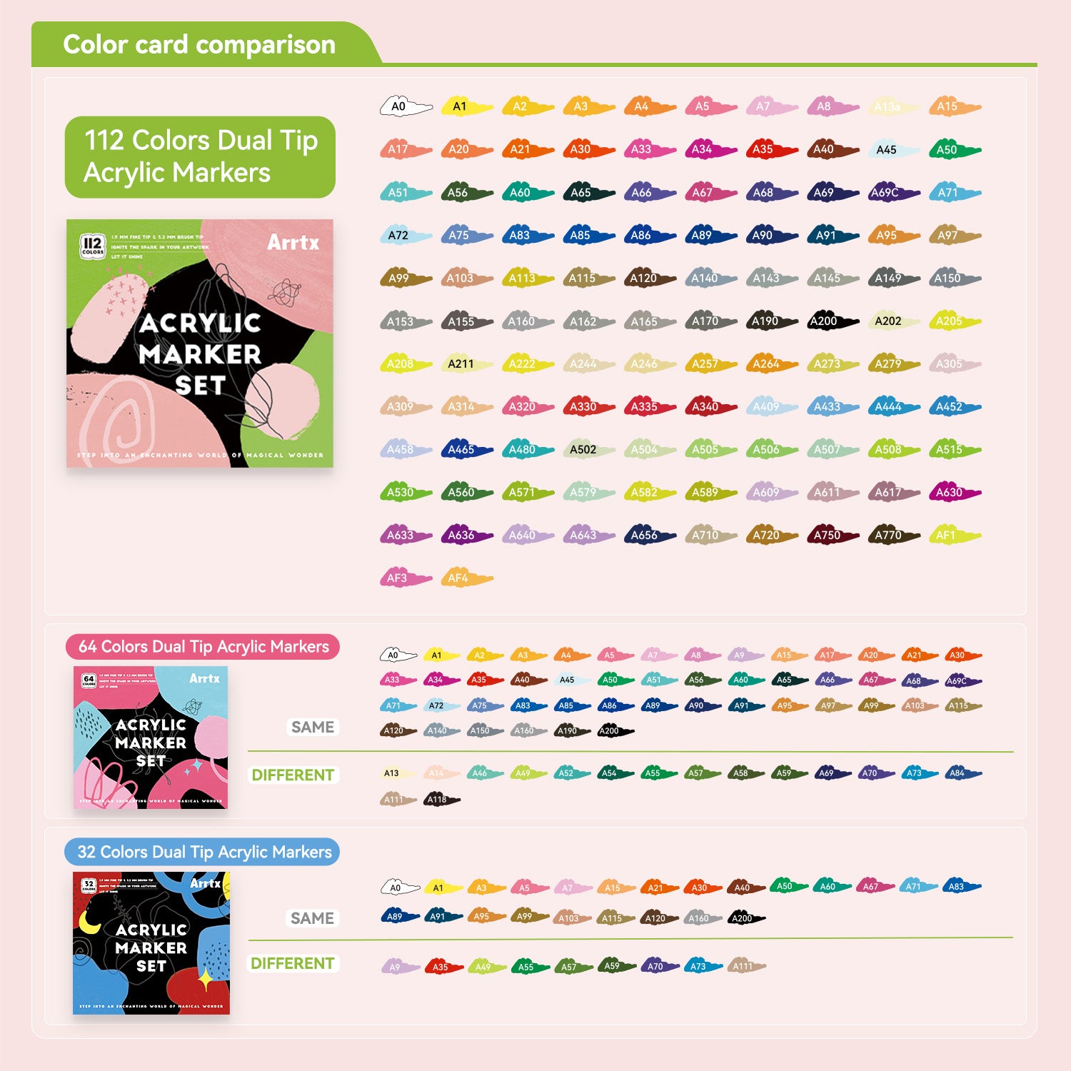 The 112 colors acrylic marker set is a new version of 64 color acrylic marker set, 24 colors set and 32 colors set. It continues the advantages of the previous color sets and adds many popular colors. It is a new color set of our brand's hot-selling series.