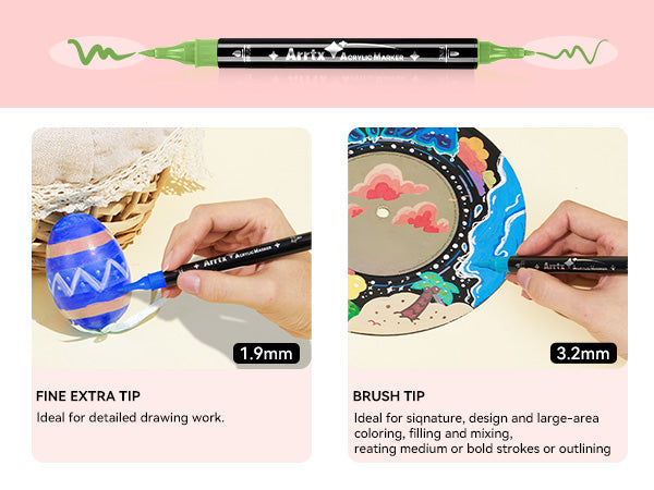 Dual-Tip Acrylic Paint Markers: Each acrylic pen has two types of tips: 3.2mm fine tip and 1.9mm fine tip nibs. 3.2mm brush tip nibs are ideal for creating medium or bold strokes, and 1.9mm fine tip nibs make pens ideal for detailed drawing work.