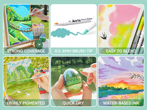 • Quik Dry and Waterproof: The highly pigmented paint is high covering, water-resistant, and abrasion-proof proof allowing the application to any surface. Arrtx acrylic paint pens are water-based ink. These paint markers flow without flooding or jamming, it's permanent when dry. Note: Please tighten the cap and leave the pen with the tip facing down if you don't use them.