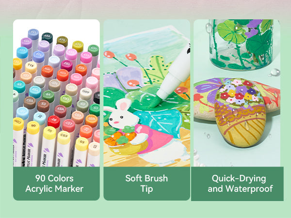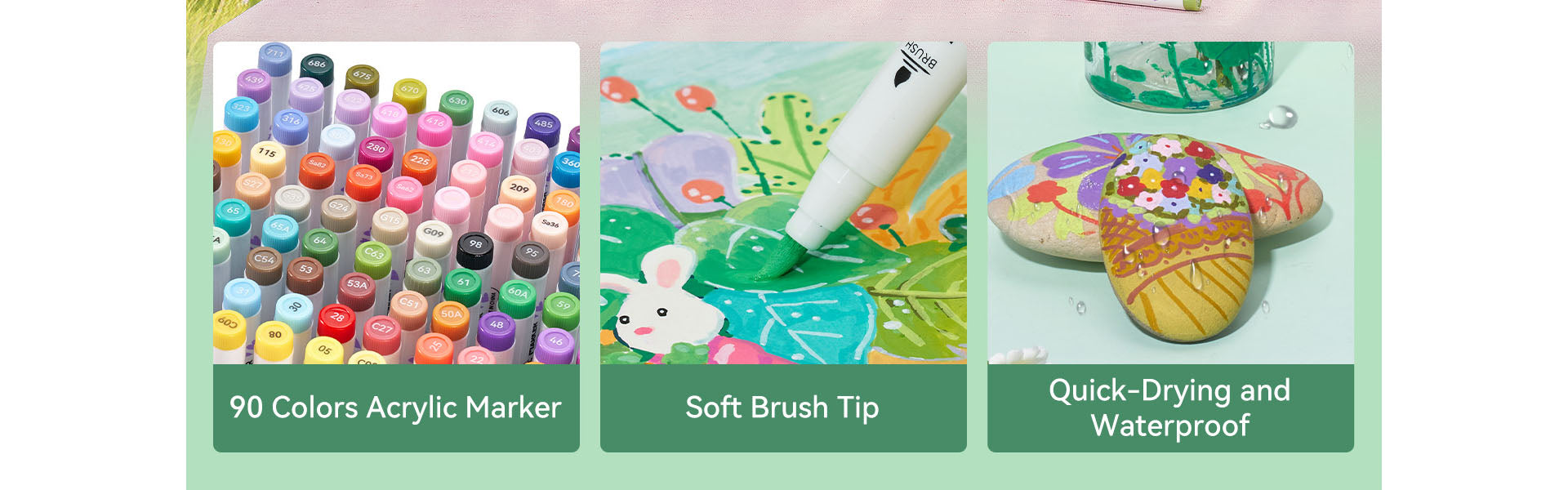 • Arrtx 90B color acrylic paint markers set- Compare with Arrtx 90A markers set, this set has 35 colors from the 90A regular color set. If you have bought before our arrtx brush tip all series, this set adds 24 new colors. This marker set provides more new color shades for creativity.