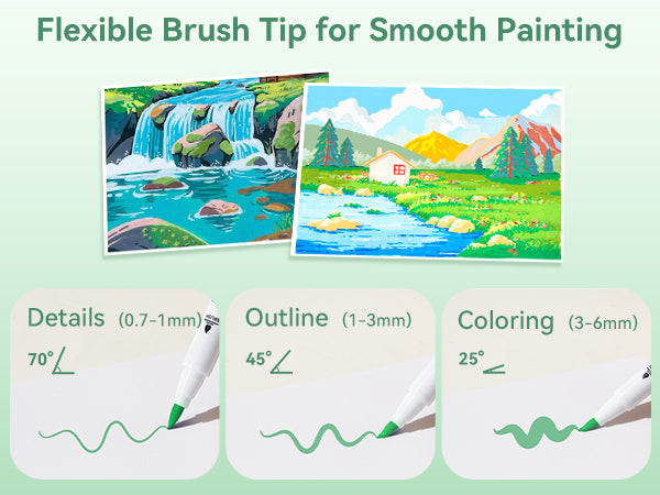 • Easy to Apply, No Pressing Down, No Shaking: With the new design, these pens are very easy to apply and no need to shake and press for tips while using, you only need to open the cap to use the pen. The round pen body made it comfortable to grip. Featuring a 1-6mm brush tip, these water-based markers are perfect work at both large-scale painting and intricate detail work.