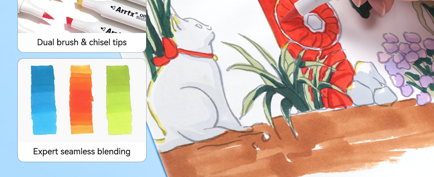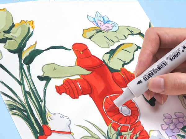 Each pen is equipped with a broad chisel tip and a brush point tip for drawing with thin or thick lines, detail processing, and extensive area coverage, and allows you to create animes, sketches, designs, etc.