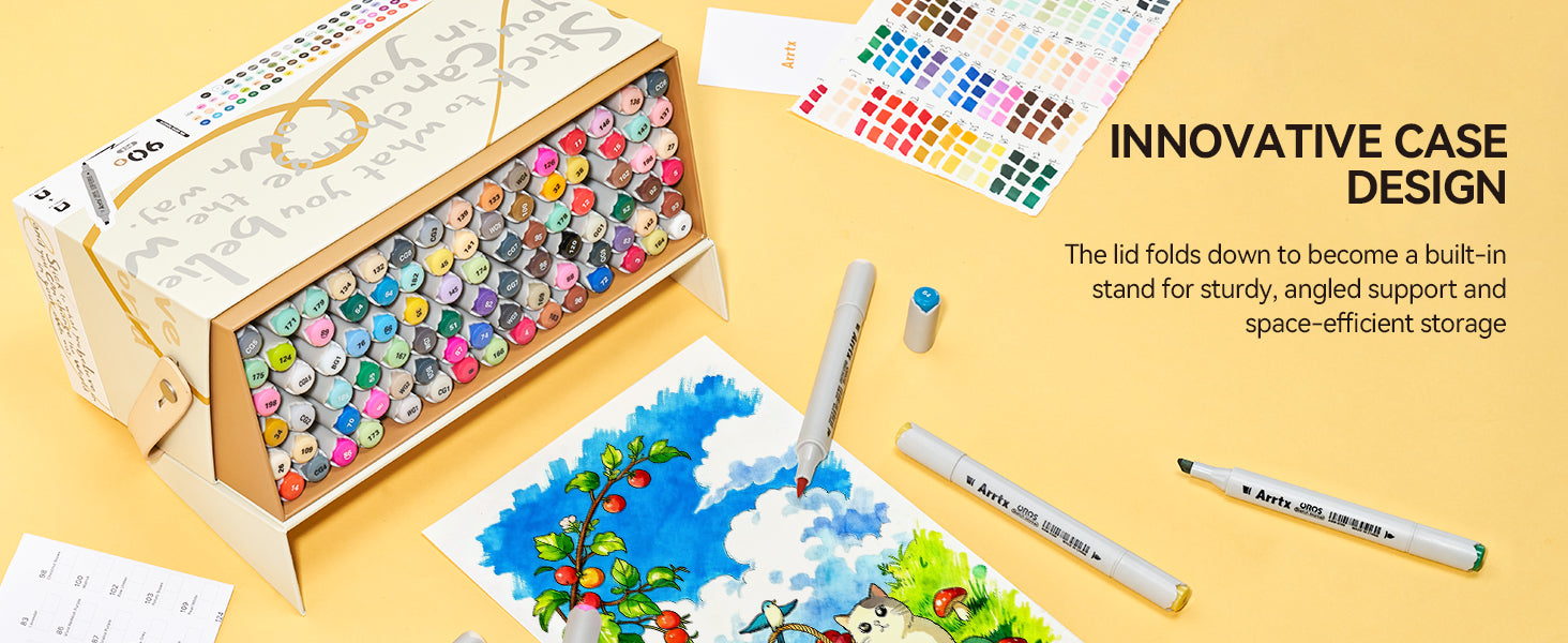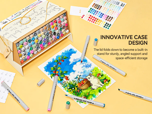 - 【Creatively Packaged for Portability 】: Our set of 90 markers comes elegantly packaged in a creatively designed gift box. The box features stable grids with 90 wells to keep your markers organized and tidy. The top cover of the box doubles as a convenient stand, ensuring easy access to the right colors. Whether it's back-to-school season, Halloween, Christmas, Thanksgiving, birthdays, or New Year, our beautifully packaged alcohol marker sets make perfect gifts for drawing enthusiasts.